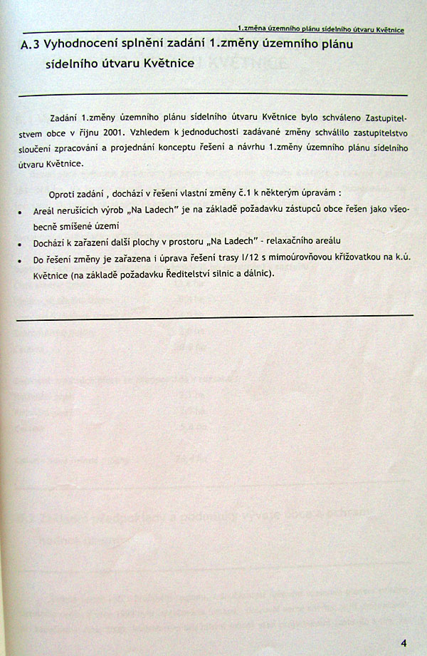 1. změna územního plánu sídelního útvaru Květnice z ledna 2002. Celkem 33 stran.